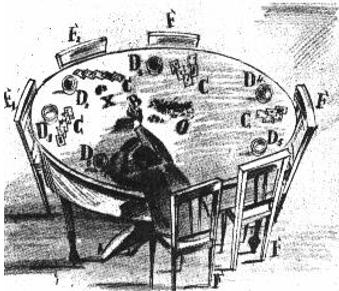 Fichas no centro da mesa; X. Marca de um copo de vinho; B.